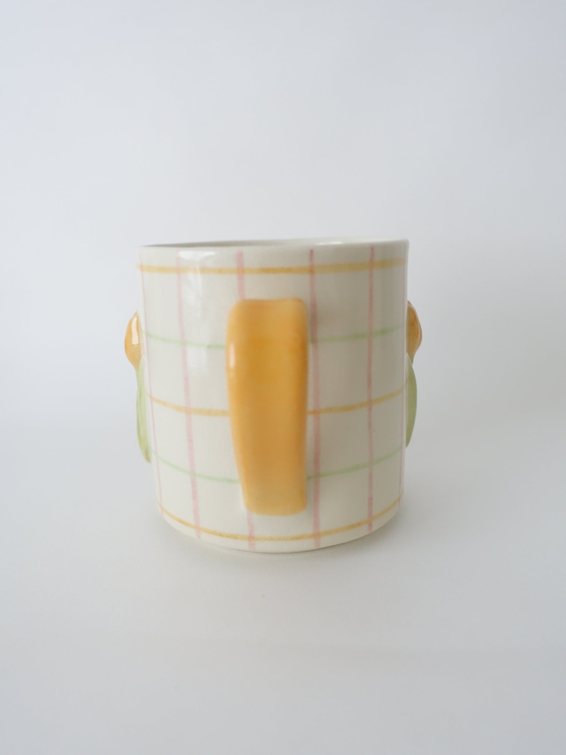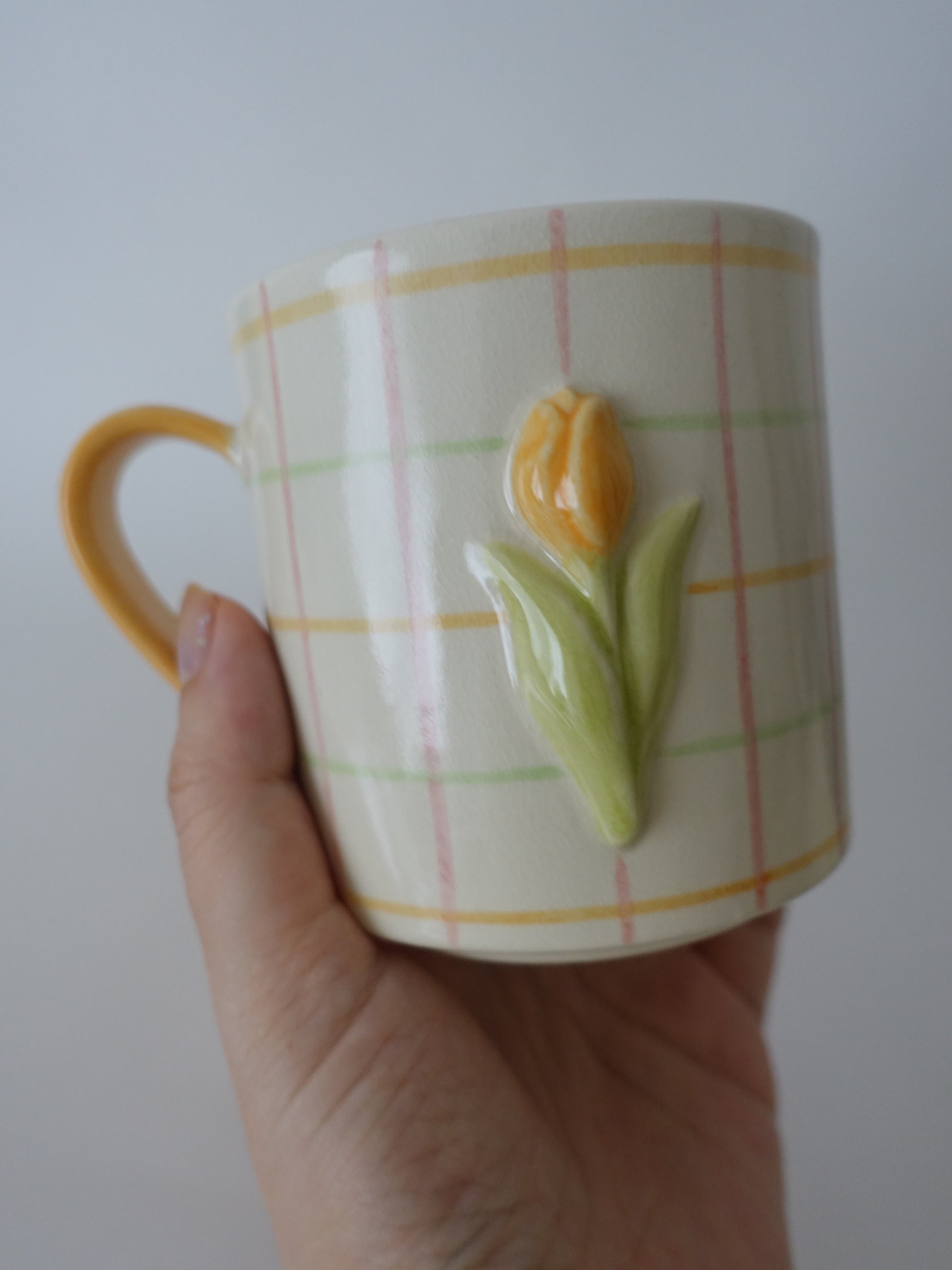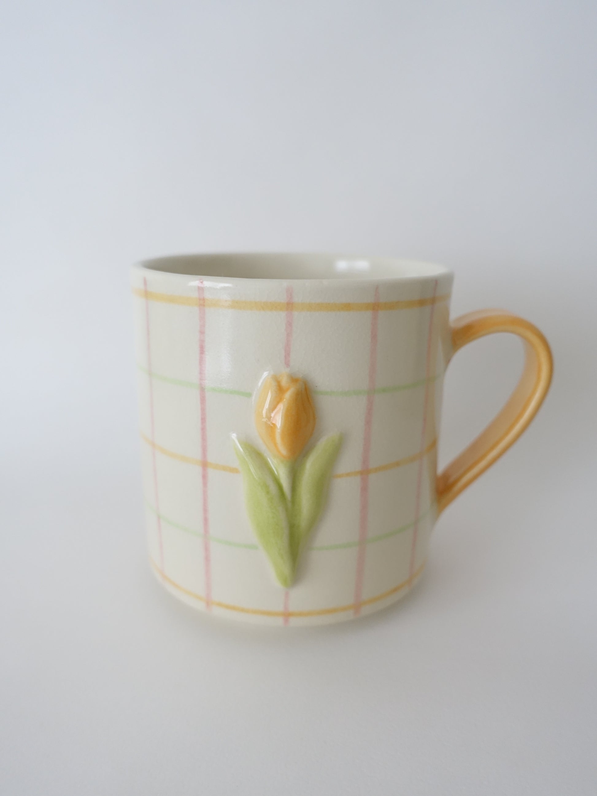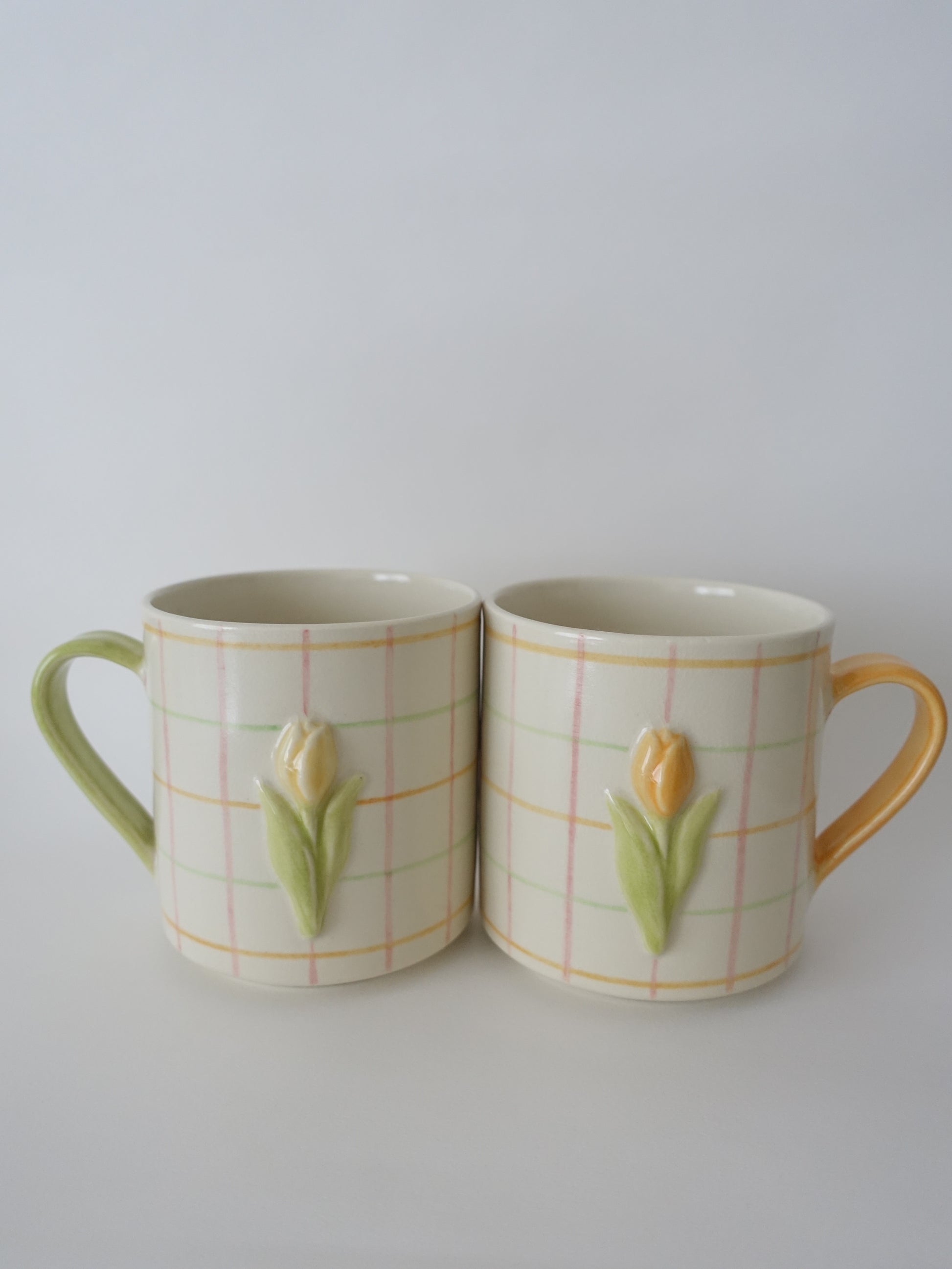 陶芸家・オオヤサイリさんによるチューリップモチーフのマグカップに、カラフルな格子模様の新作が登場しました。