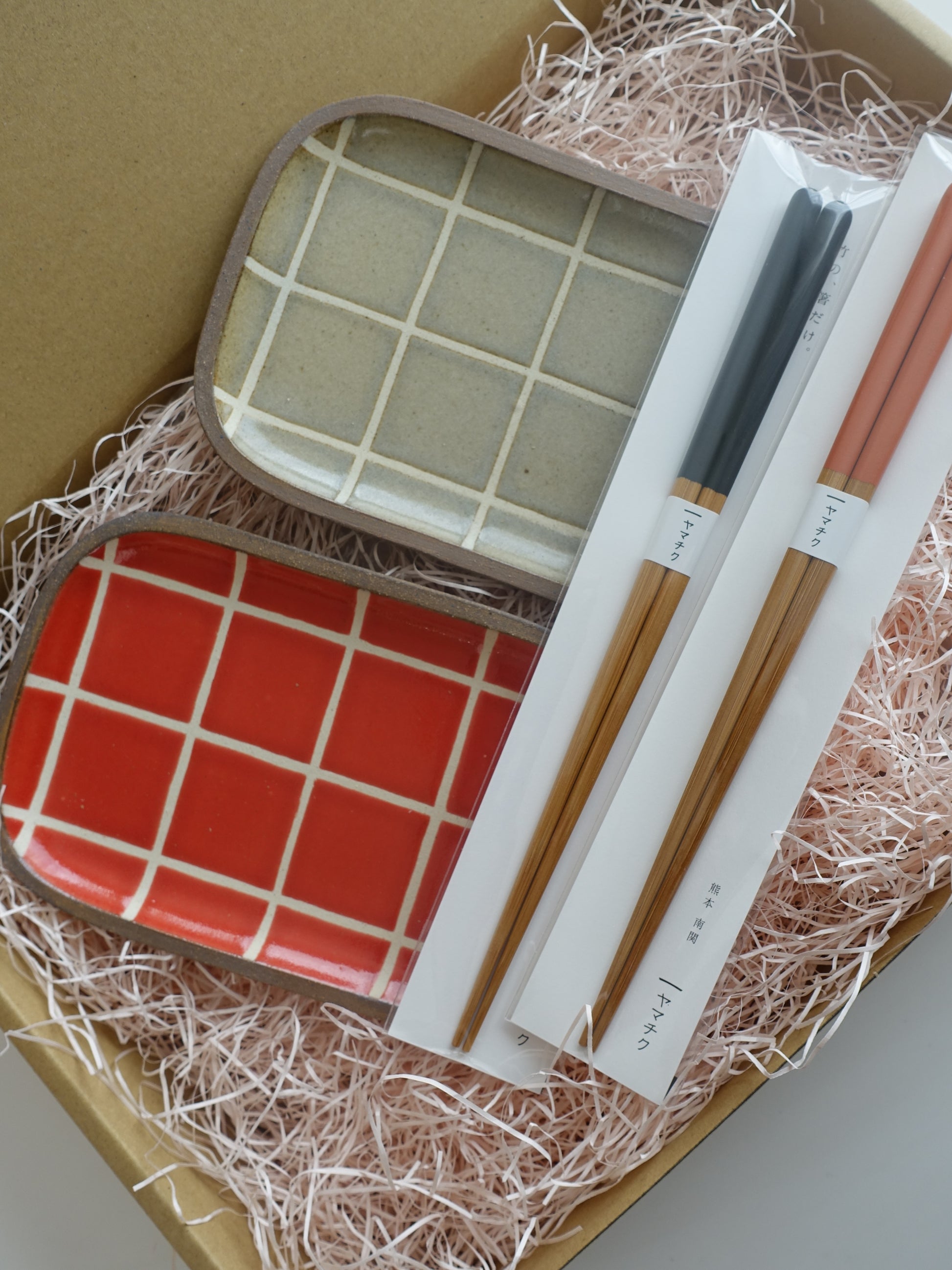結婚や引っ越しのお祝いに、レトロで可愛いタイル皿としなやかで丈夫なお箸をセットにしました。